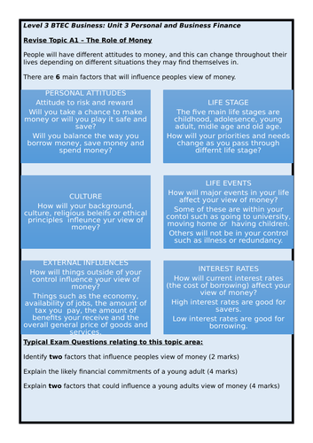 Btec Level 3 Business Unit 3 Personal And Business Finance Exam Revise Role Of Money A1 Teaching Resources
